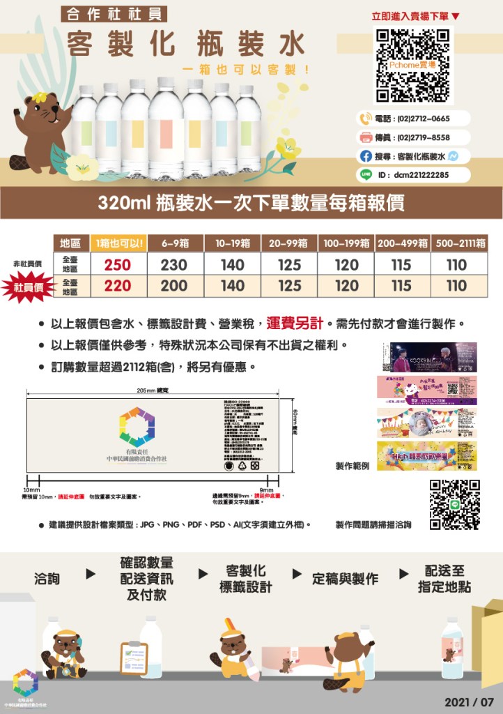 【一箱客製】客製化瓶裝水 2021 年 7 月 15 日2021 年 7 月 20 日 / Ryan Chang / 發表迴響 無論是在小孩周歲派對、髮廊、美容中心、公司自用及門店開幕等都可訂做專屬瓶裝水唷!歡迎來電了解! 如欲購買客製化瓶裝水請置PCHOME商城購買! 【320ml 客製化瓶裝水/一箱24瓶/運費另計】建議售價300元社員價1到5箱220元/箱社員價6到10箱200元/箱 內容量320ml原產地(國)台灣南投保存期限1年廠商名稱加吉利實業股份有限公司